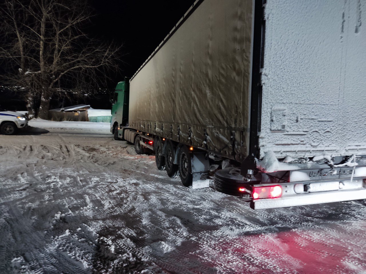 Внимательные инспекторы заметили грузовик «КамАЗ» с полуприцепом, застрявший на снежном подъеме. Приблизившись к автомобилю, водитель объяснил, что он не местный и не знаком с этим участком дороги, поэтому не смог преодолеть заснеженный подъем.